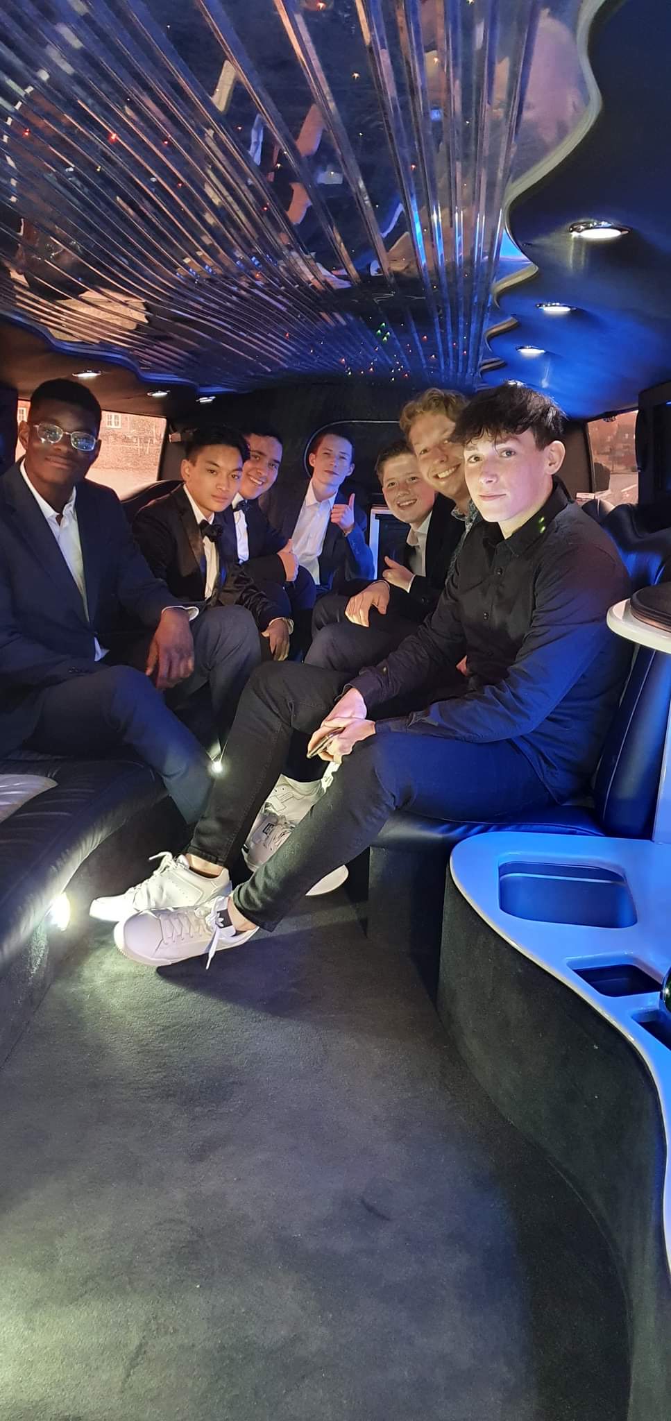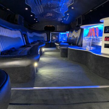 Een feestelijke limousine met sfeerverlichting en luxe interieur.